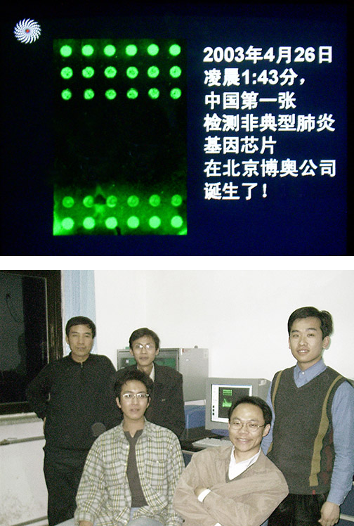 2003年4月26日,博奧生物SARS項目組與解放軍302醫院、中國疾病預防控制中心病毒預防控制所和清華大學(xué)第一附屬醫院精誠合作,刻苦攻關(guān),于凌晨1點(diǎn)43分,研制成功全球首張專(zhuān)門(mén)用于SARS病毒檢測的基因芯片,實(shí)現了對“非典”病人臨床樣本的檢測和確認。臨床驗證和排查工作的結果表明,SARS病毒檢測基因芯片在技術(shù)方法的嚴謹性、發(fā)病早期檢測、檢測準確率和靈敏度等方面均有明顯優(yōu)勢,為SARS病毒的快速早期臨床診斷提供了可靠高效的方法和途徑。
