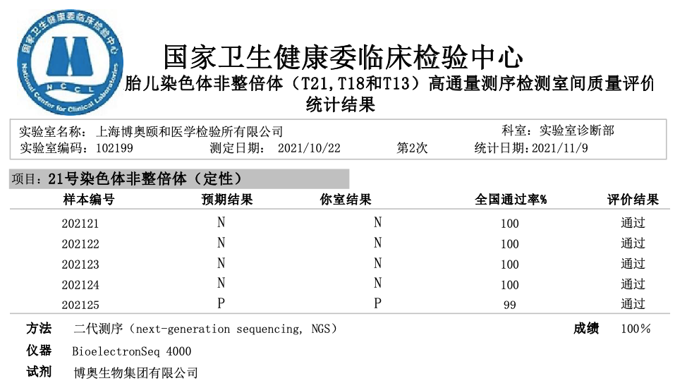 近日,國家衛生健康委臨床檢驗中心發(fā)布了《2021年外周血胎兒染色體非整倍體(T21,T18和T13)高通量測序檢測室間質(zhì)量評價(jià)結果》,博奧旗下北京、廣東、成都等11家檢驗實(shí)驗室全滿(mǎn)分通過(guò)。