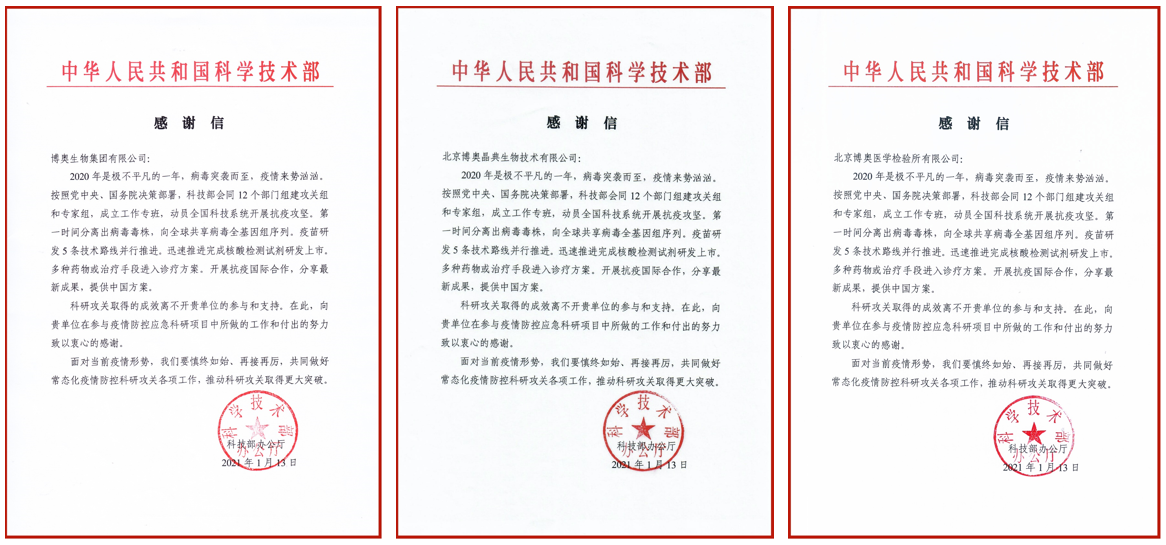 近日,科技部辦公廳向博奧生物集團及旗下北京博奧晶典生物技術(shù)有限公司、北京博奧醫學(xué)檢驗所、成都博奧晶芯生物科技有限公司致感謝信??萍疾吭谶@封信中表示,科研攻關(guān)取得的成效離不開(kāi)博奧的參與支持,向博奧在參與疫情防控應急科研項目中所做的工作和付出的努力致以衷心的感謝。同時(shí),科技部寄語(yǔ)博奧,面對當前疫情形勢,要慎終如始、再接再厲,推動(dòng)科研攻關(guān)取得更大突破。