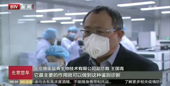 3月1日,BTV北京電視臺《北京您早》早間新聞報道了博奧為新冠病毒疫情設計開(kāi)發(fā)并獲批的“六項呼吸道病毒核酸檢測試劑盒(恒溫擴增芯片法)”。博奧生物旗下北京博奧晶典生物技術(shù)有限公司副總裁、博奧檢驗總裁王國青接受采訪(fǎng)并介紹了該試劑盒的獨特優(yōu)勢及生產(chǎn)情況。