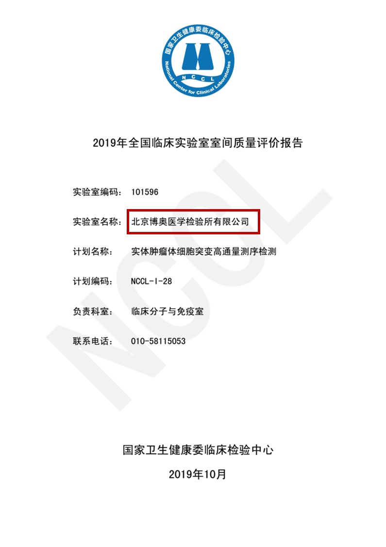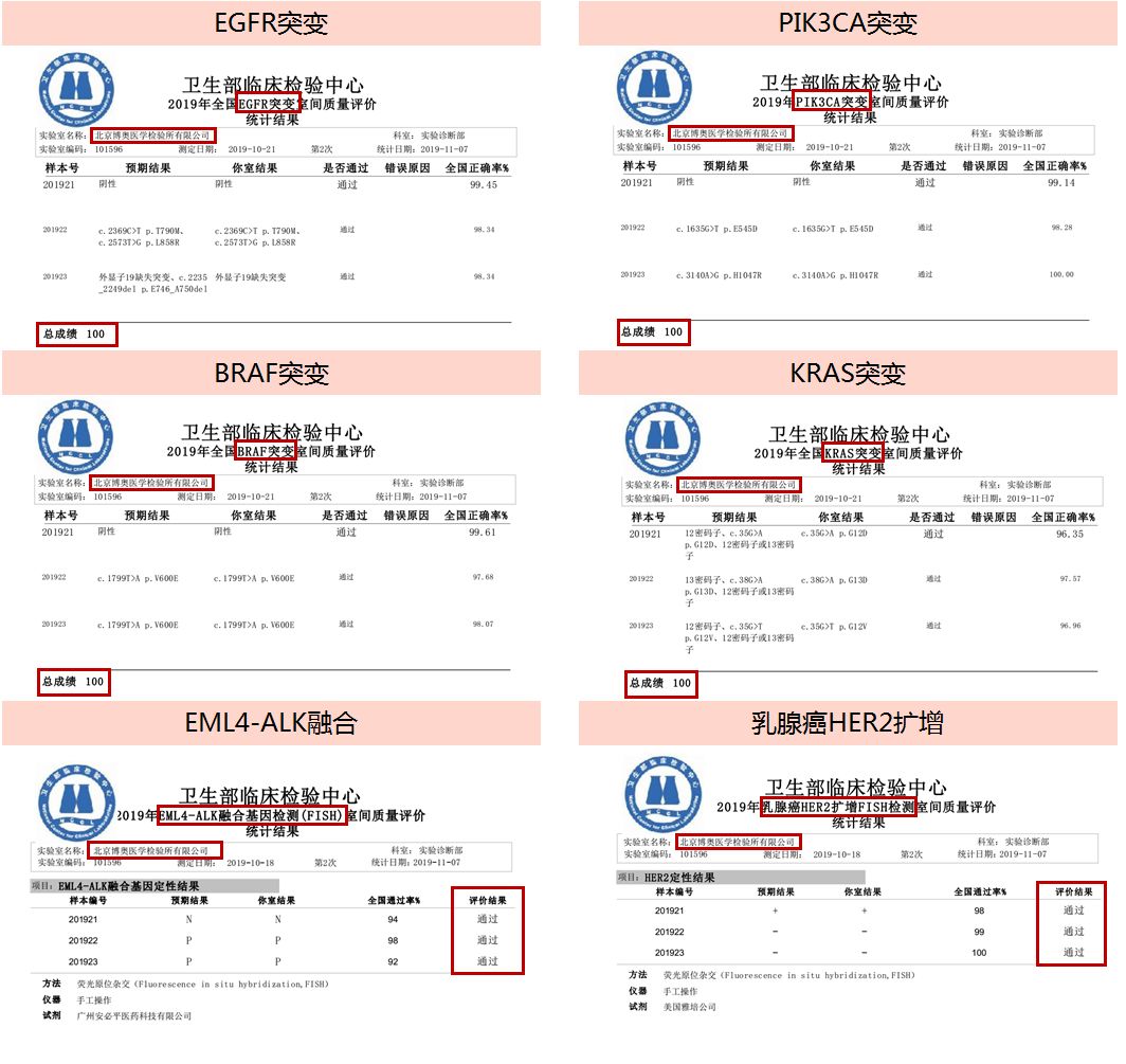 近日,國家衛生部臨床檢驗中心(NCCL)發(fā)布了關(guān)于實(shí)體腫瘤體細胞高通量測序檢測、EML4-ALK融合基因、BRAF突變、EGFR突變、KRAS突變、PIK3CA突變、乳腺癌HER2擴增等室間質(zhì)評項目結果,北京博奧晶典生物技術(shù)有限公司旗下北京博奧醫學(xué)檢驗所不負眾望,再次以全滿(mǎn)分的優(yōu)異成績(jì)通過(guò)上述全部考核項目。至此,博奧在2019年國家衛生部臨床檢驗中心室間質(zhì)評項目中以?xún)?yōu)異的成績(jì)圓滿(mǎn)收官。