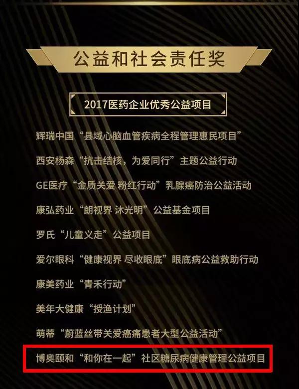 2017年12月29日,歷時(shí)2個(gè)月的報名篩選、網(wǎng)絡(luò )投票以及專(zhuān)家評審,“榮曜2017·新浪醫藥年度總評榜”十大獎項重磅揭曉!其中,博奧頤和“和你在一起”社區糖尿病健康管理公益項目榮獲“公益和社會(huì )責任獎”,同獲此項殊榮的企業(yè)還有輝瑞中國、GE醫療、康弘藥業(yè)、羅氏等企業(yè)。