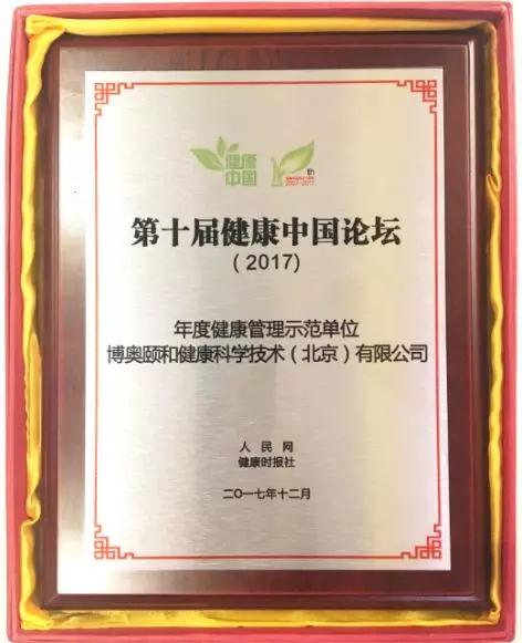 2017年12月29日,第十屆健康中國論壇在北京萬(wàn)達索菲特大酒店隆重舉行。經(jīng)組委會(huì )初選、業(yè)內專(zhuān)家推薦、廣泛征求人民群眾意見(jiàn)等,論壇推選出健康產(chǎn)業(yè)十大年度人物、年度健康管理示范單位等。博奧頤和健康科學(xué)技術(shù)(北京)有限公司(簡(jiǎn)稱(chēng)“博奧頤和”)在眾多企業(yè)單位中脫穎而出,榮獲“健康管理示范單位”稱(chēng)號,同獲此項殊榮的單位還有伊利中國、麥肯錫健康、上海賽鼎生物科技有限公司、賽德陽(yáng)光口腔、燕達醫院等。