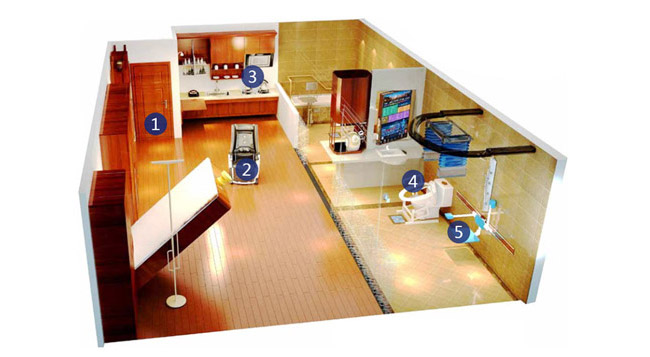 ? 沐浴區兩側熱風(fēng)烘干機可遙控升降為老人浴后自動(dòng)干身
